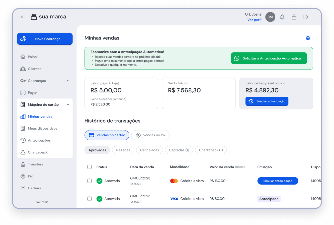 Plataforma de adquirência white label completa, com ótima experiência de compra e venda e com várias formas de ganhos para o seu negócio crescer cada vez mais.